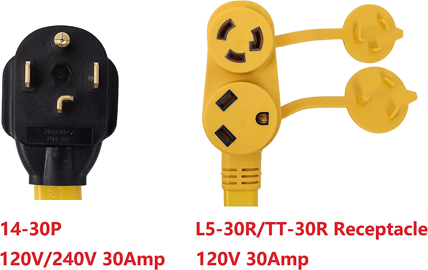 NEMA 14-30P to TT-30R/L5-30R 2 Outlet 120V 30 Amp 15 FT 10 AWG 4 Prong Male Plug to 3 Prong Female Receptacle RV Generator Power Cord Adapter