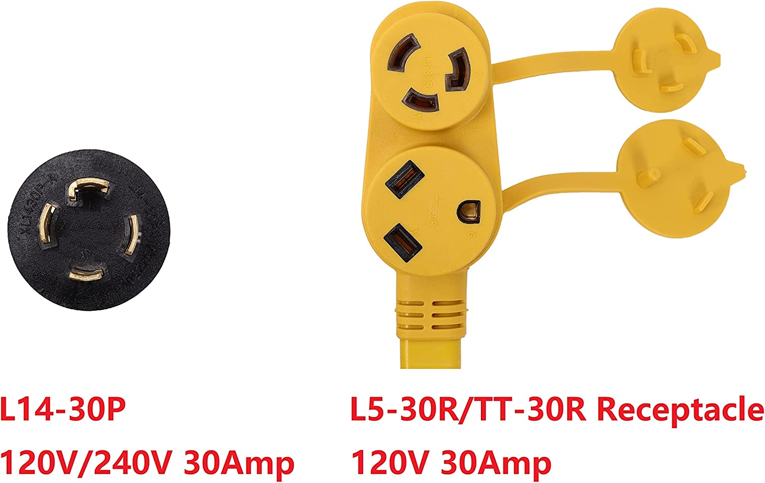 NEMA L14-30P to TT-30R/L5-30R 2 Outlet 120V 30 Amp 1.5 FT 10 AWG 4 Prong Male Plug to 3 Prong Female Receptacle RV Generator Power Cord Adapter