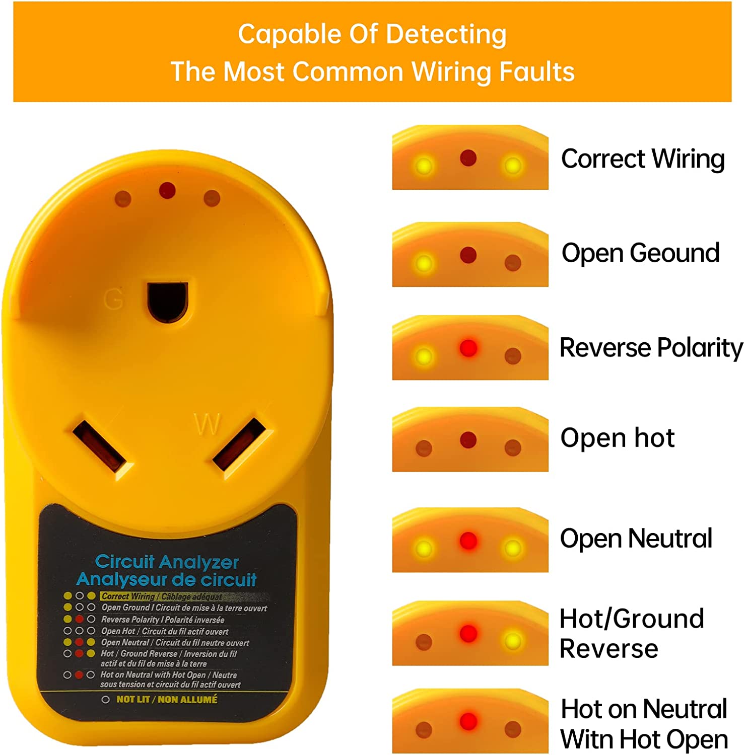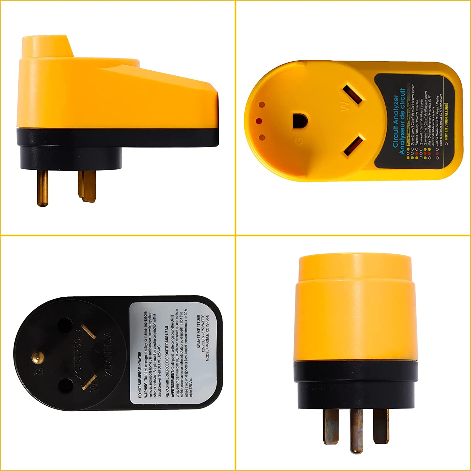 RV 30 Amp adapter circuit analyzer with integrated surge protection connects directly to your campsite’s power pedestal. Once connected, it has a series of diagnostic LEDs that indicate the status of the source circuit. The different lighting combinations will alert you of any electrical issues, protect your campers from power surges